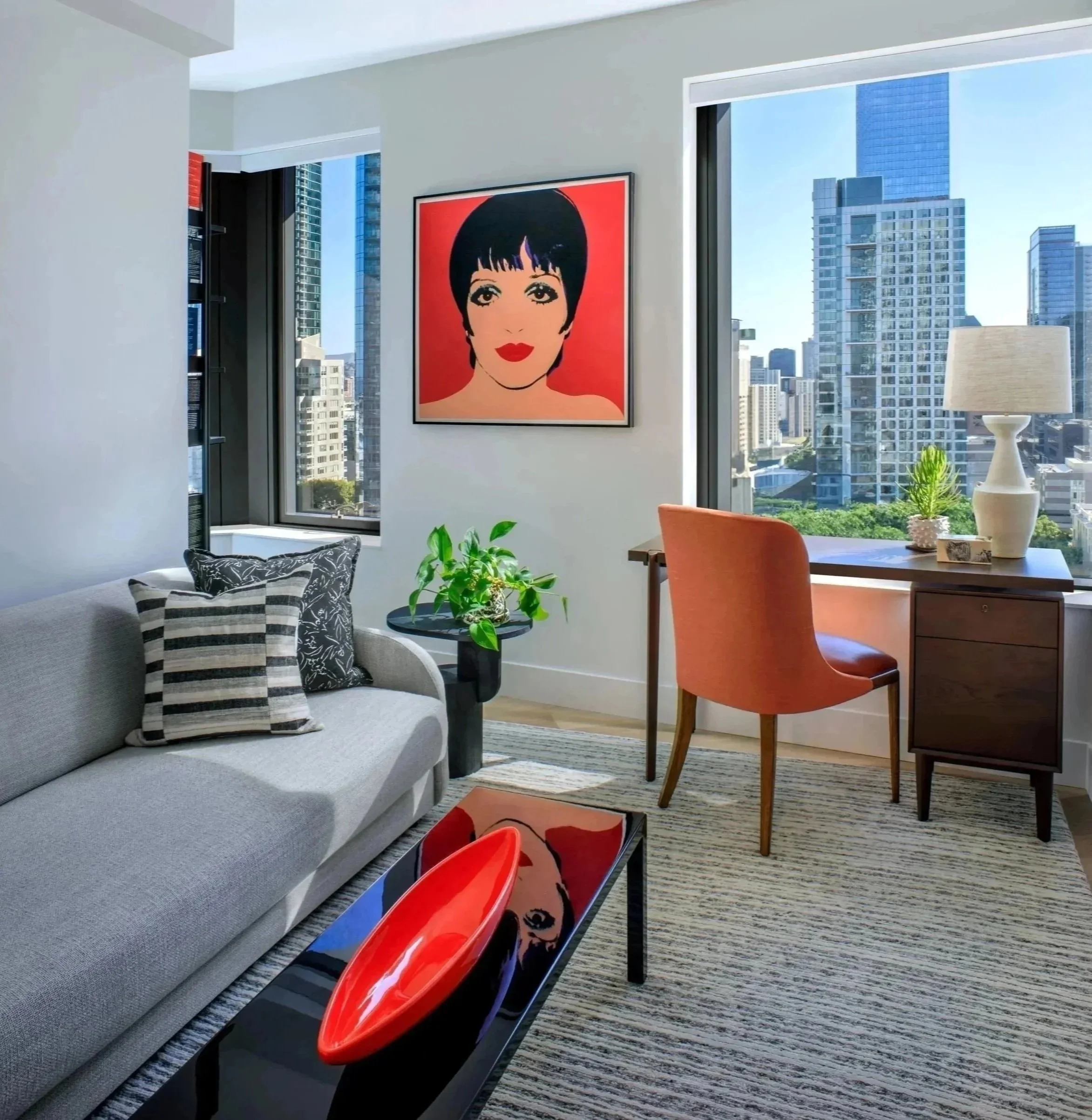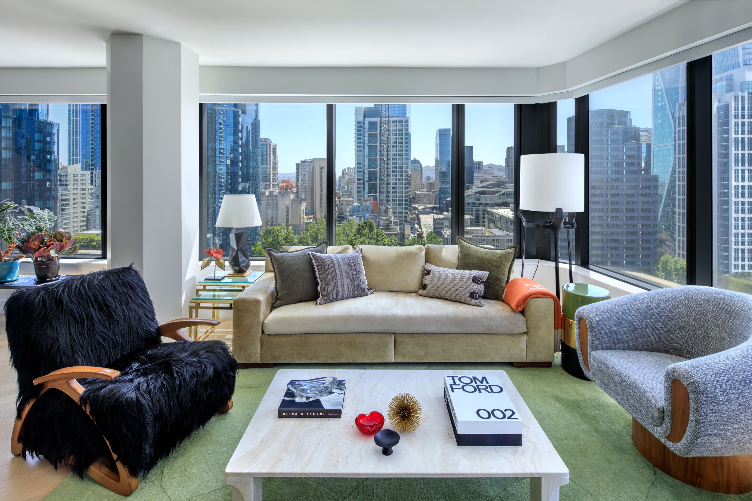 For these busy restaurateurs, creating a space for respite away from their hectic daily schedules was imperative. Taking inspiration from iconic American fashion legends like Halston and Tom Ford, this sophisticated couple leaned into refined glamour and minimalism – hallmarks of the high-rise Mira tower by Studio Gang where they live. Straddling SOMA and the Embarcadero neighborhoods, it is a twisting column of stacked floors, looking like something out of a Futurist painting.