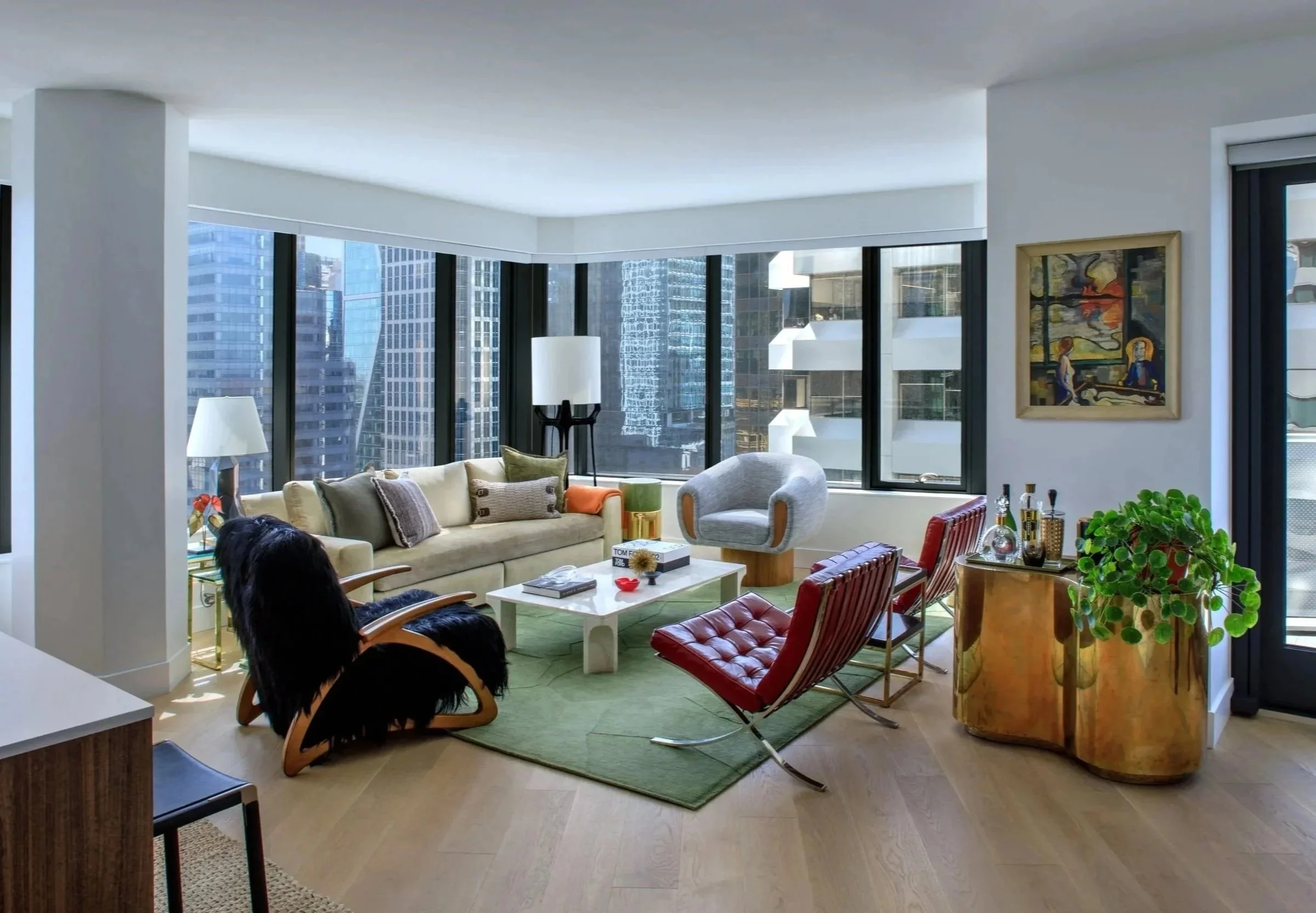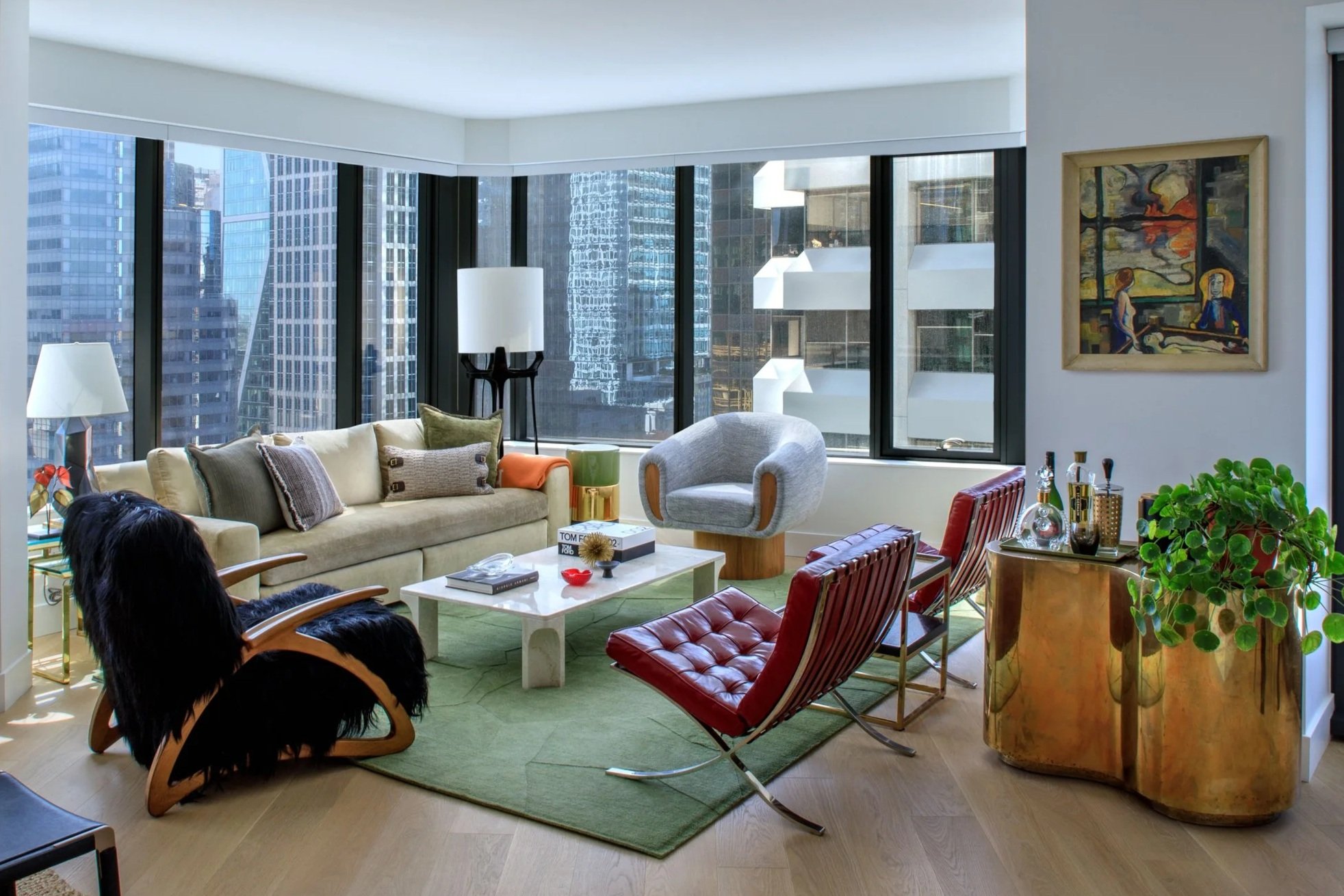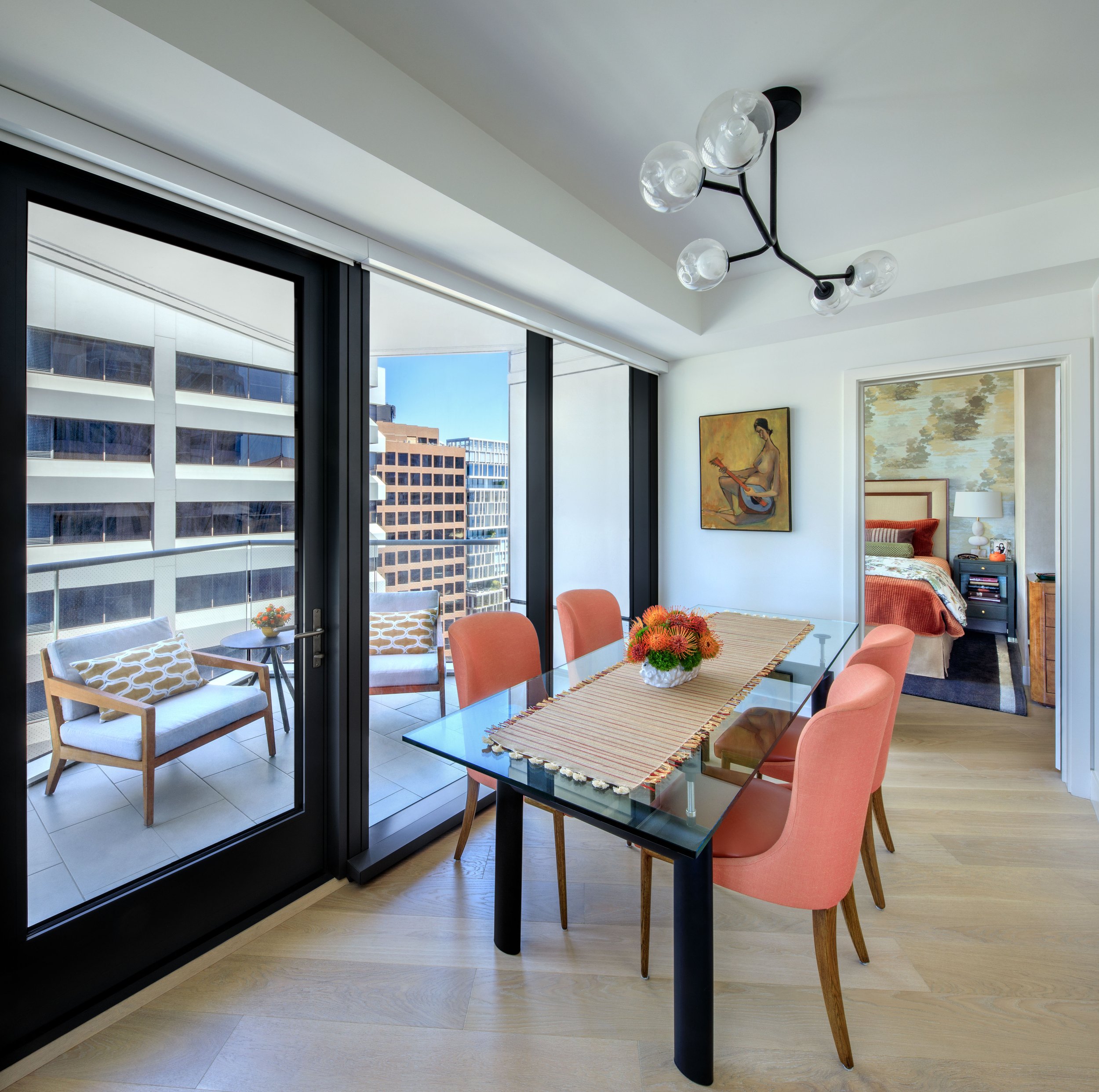 Walking through the atmospheric entry, one enters the heart of the home, comprised of the kitchen, living, and dining areas. Framed by large windows, the urban San Francisco landscape becomes the backdrop against which we layered soft, textural materials in similar hues of green, gold, and black as the entry, but accented by ruby-red leather chairs. Sensual, organic-shaped furniture pieces dot the space, and the brass kidney-shaped console doubles as a mini bar, leading into the dining area. Here, dining chairs in an orange fabric and caramel leather add another pop of brightness to the space, especially against the angular glass dining table and bubble ceiling fixture overhead.