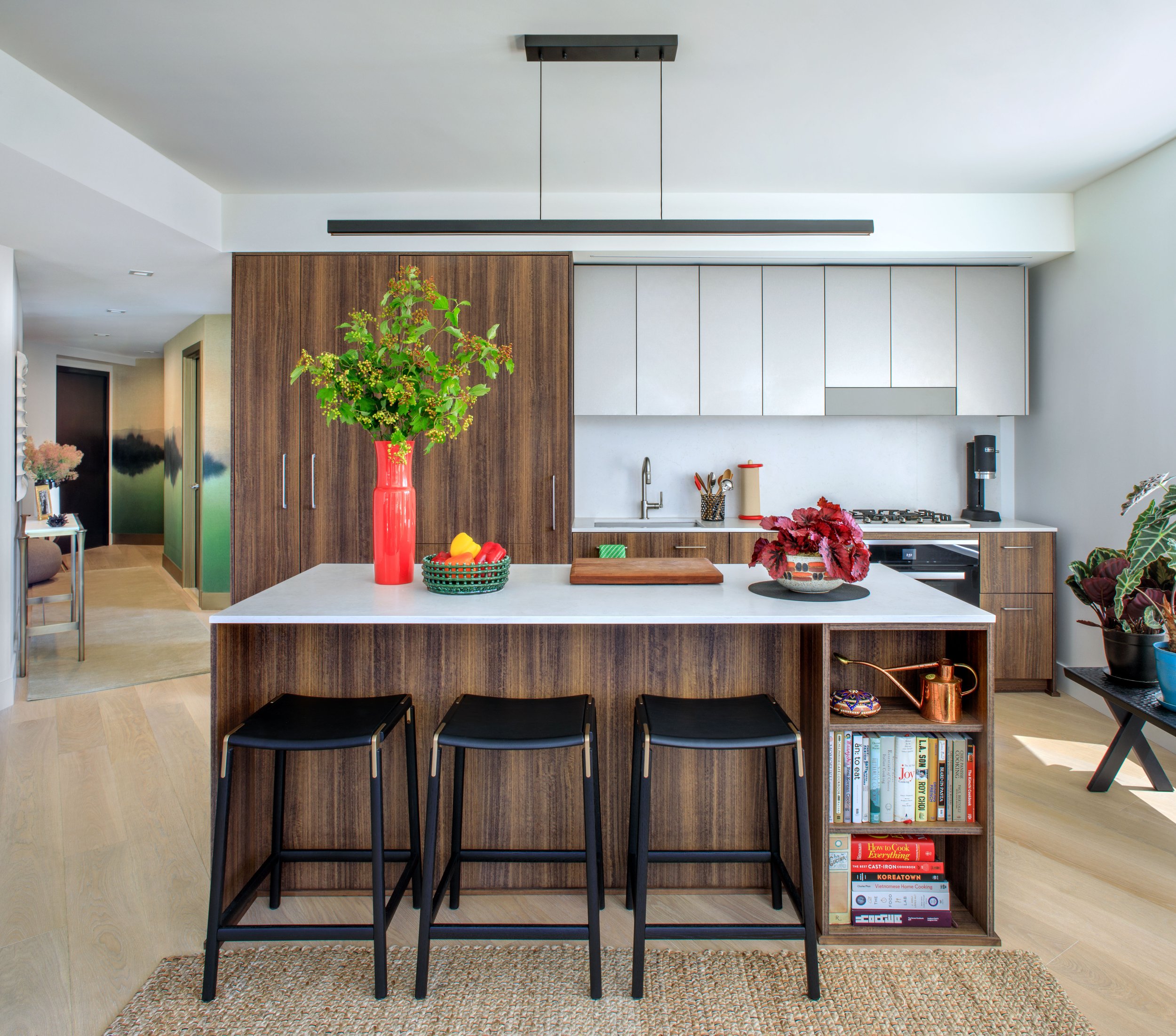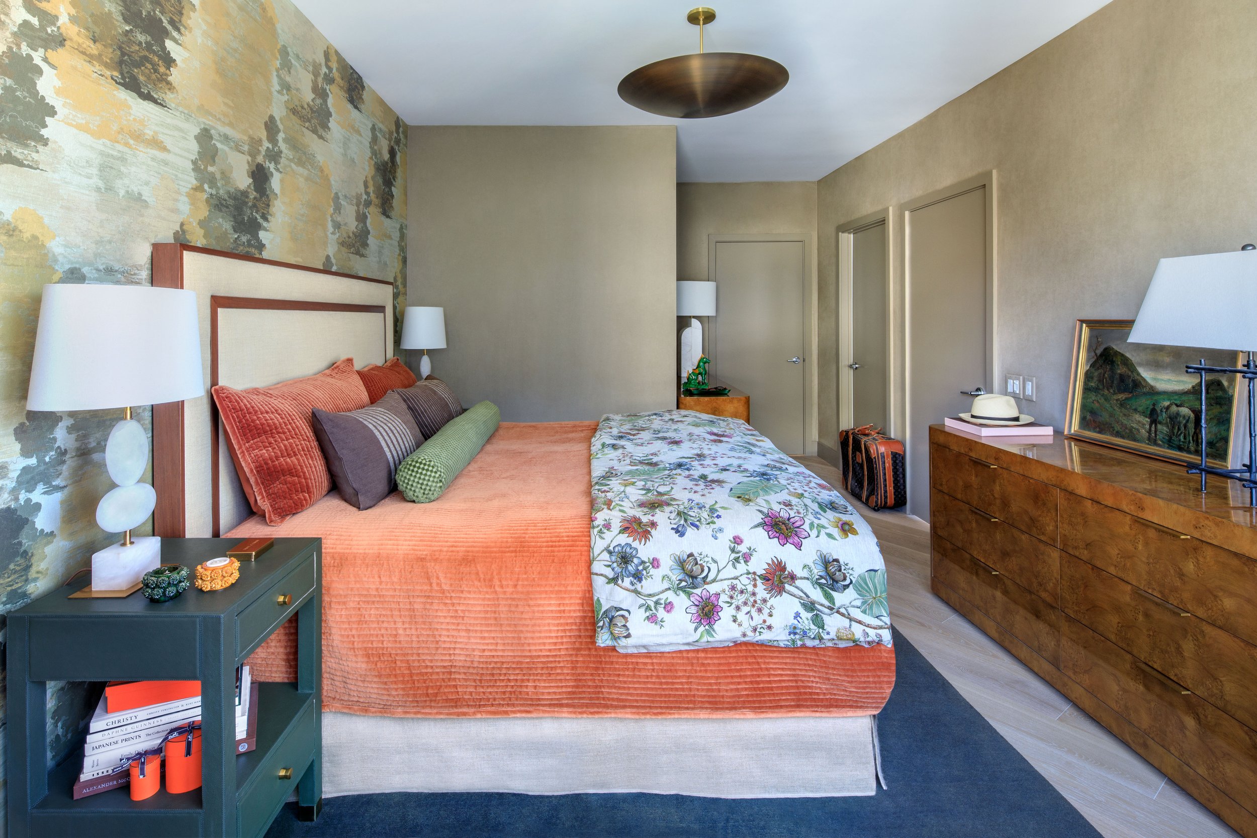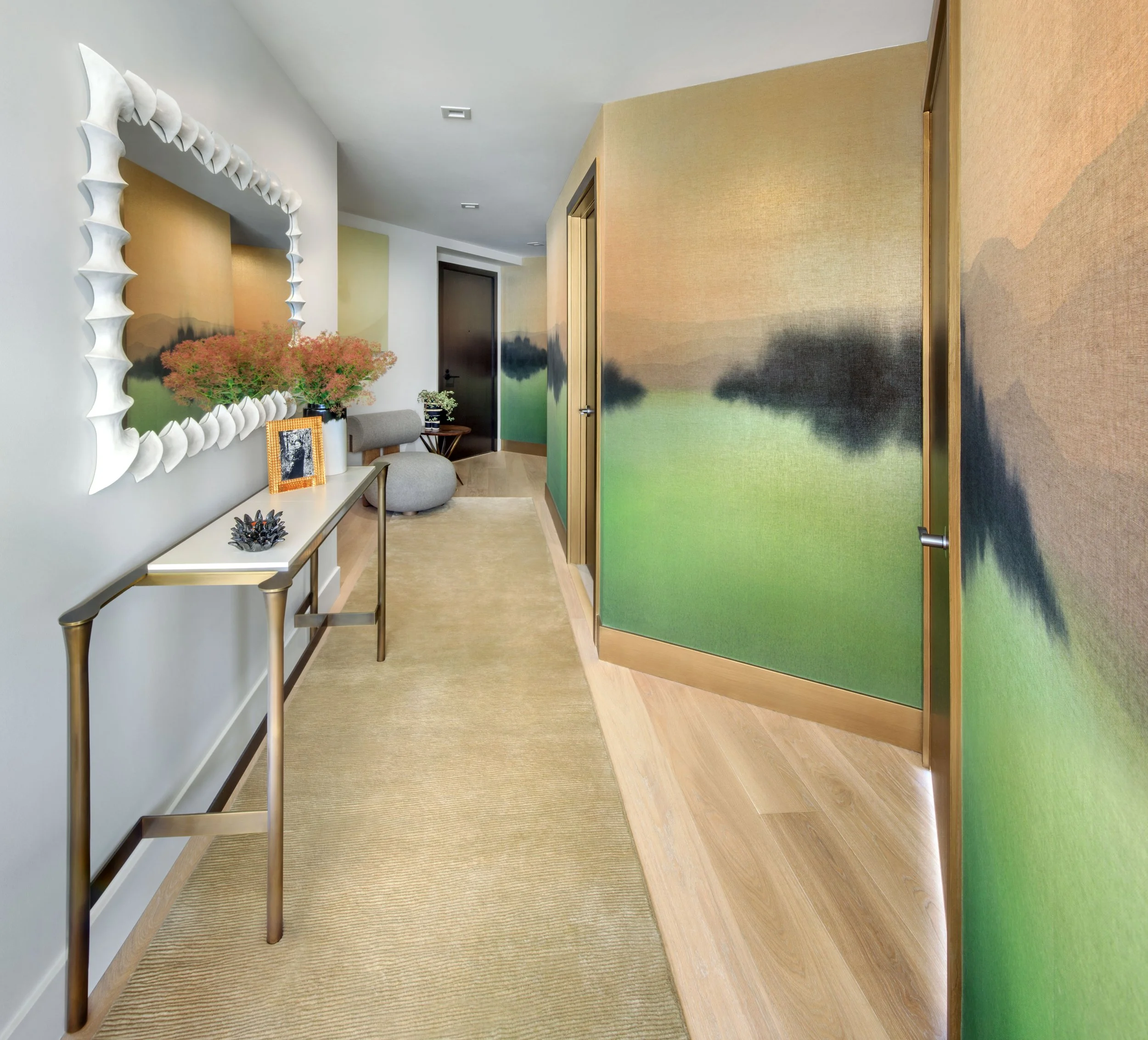 As you enter, a custom mural sets the stage with its rich emerald green, shimmery metallic bronze and copper, and black blots, printed on textured grasscloth wallpaper. While evoking an Asian sensibility, its abstract pattern defies an exact locale; a distant horizon leads the eye beyond the otherwise narrow hallway. The couple had to leave behind a beloved Japanese screen in similar colors, so we transformed the blank faceted canvas to bring that nostalgia into their new home. The doors and trim were painted in metallic brass to blend with the mural.