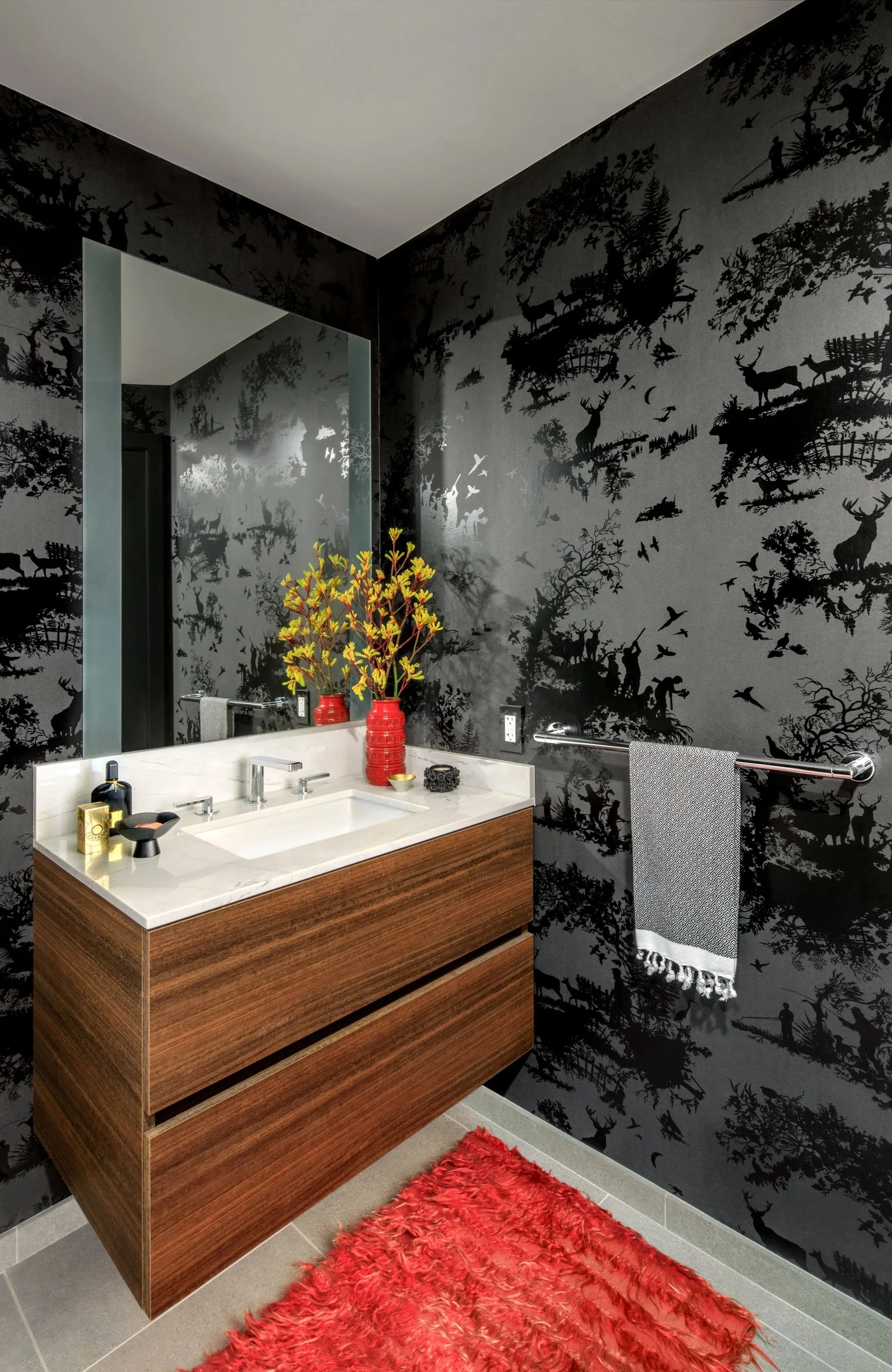 A compact powder room tucked behind the first door was covered in a black-on-black contemporary take on toile wallpaper, a pattern that is at once masculine in color but delicate in its intricate silhouette of a hunting scene. The glossy pattern pops off the walls in a clever play against the matte background.