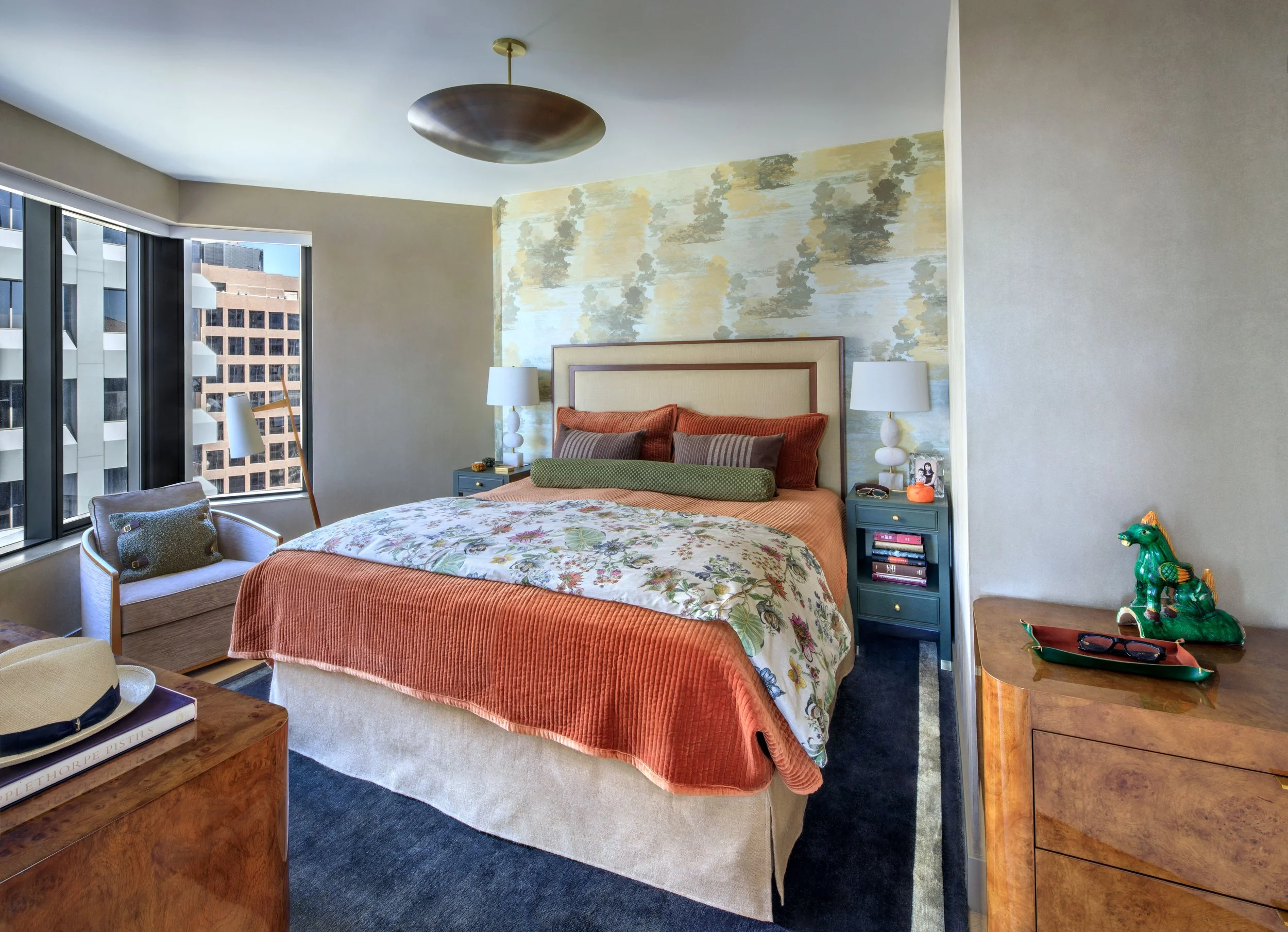 As one pivots towards the dining area, you get a glimpse into the primary bedroom with its ethereal cloud toile wallpaper, again an illusion of being already high in the sky. As requested by the client, the other walls are covered in a velvety suede wallcovering, and it’s no coincidence that suede was also Halston’s go-to material for his own interiors. A bronze dome light fixture gives off a soft, ambient glow, while the swivel reading chair offers a view of the Bay.