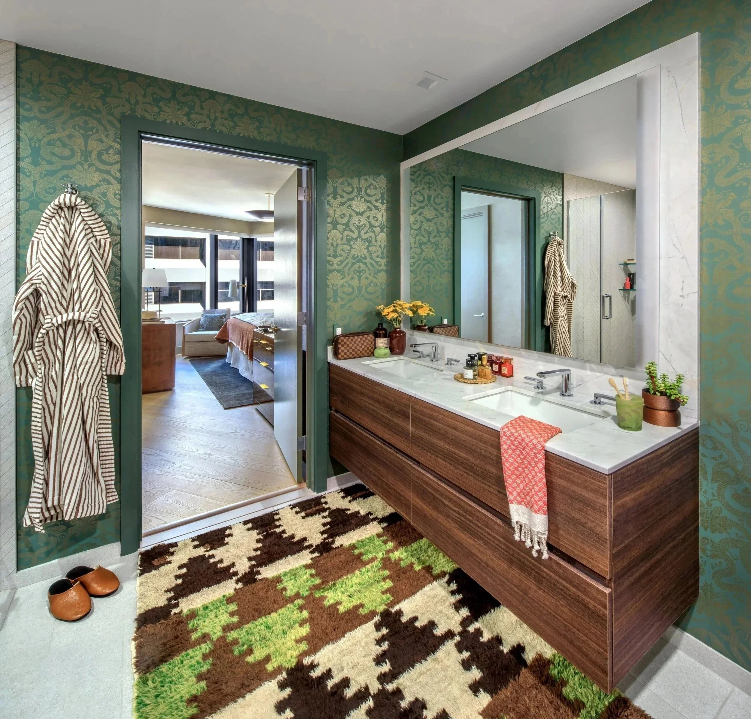The adjoining primary bathroom walls received an intertwining anaconda wallpaper in eucalyptus and subtle bronze, which gives off a soft luster in the shifting light. A graphic vintage Turkish rug provides warmth against the cool tile floor.