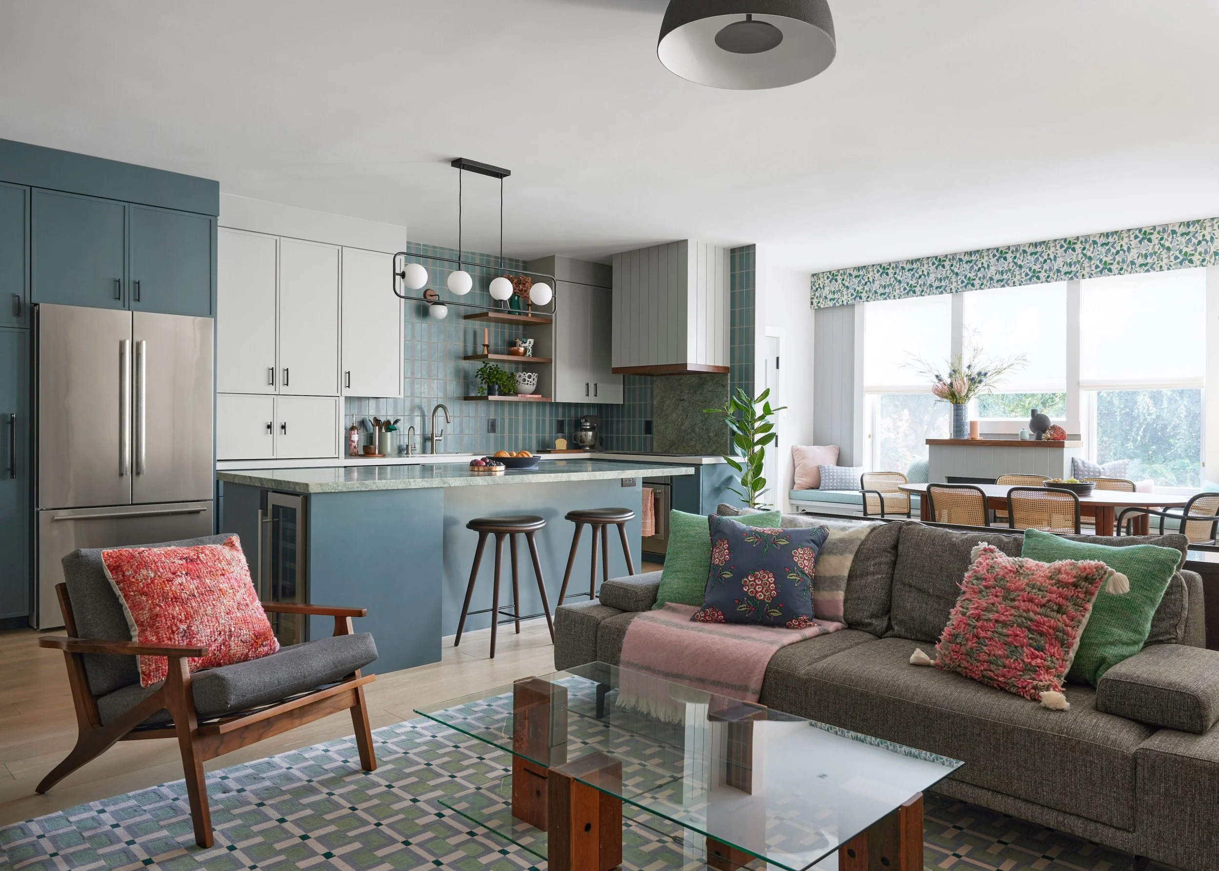Sparked over the pandemic, the couple initially reassessed the use of the two extra bedrooms and converted them into their home offices. Then the following year, they took the plunge to bring the rest of their home up to date with a full remodel. Situated in a dense, bustling neighborhood, it was important to both partners for their home to feel like a tranquil and relaxing oasis, a respite from everything outside. We achieved this by selecting a new color palette, all new finishes, patterns and elements. The soothing color palette of teals and blues, with bright, white oak floors throughout, contrasts greatly with the darker, original finishes, dating from the early 2000s.